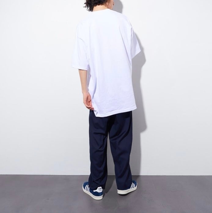 重量感のある目の詰まった生地で、首元は伸びにくいダブルステッチで狭めなクルーネックが特徴。